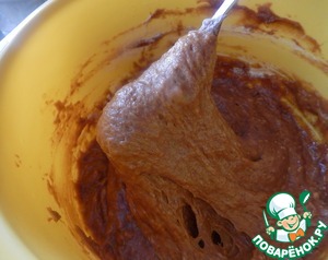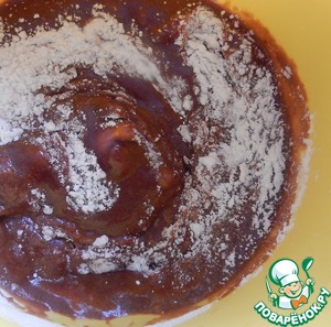 Влить кипяток. Размешать. Добавить в него 1/3 стакана сахара и ванильный сахар, размешать. Немного дать остыть. Включить духовку на разогрев на 170-180 градусов. В отдельной емкости смешать 1/4 стакана муки разрыхлитель и соду. Всыпать смесь в тесто, и хорошо перемешать.