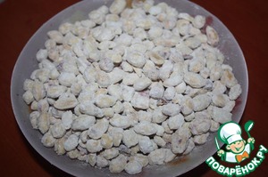 Высыпать на сковороду арахис, хорошо перемешать, чтобы арахис равномерно покрылся карамелью