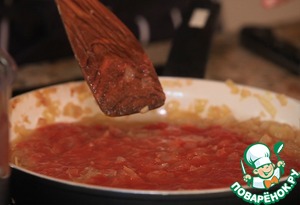 В сковородке обжарить лук на курином жиру (можно добавить немного растительного масла. После того как лук станет прозрачным и начнёт местами зарумяниваться добавить протертые томаты и уваривать соус 10-15 минут.
