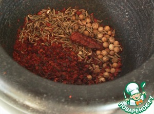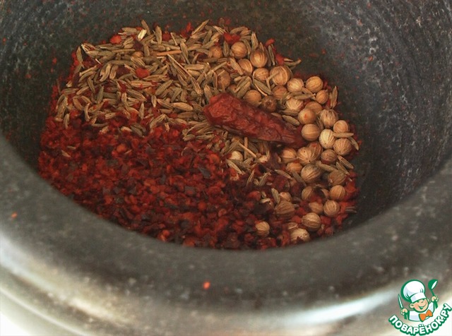 Пряности - зиру ну совсем не захотелось добавлять! Ограничилась уцхо сунели, паприкой,черным перцем из мельницы и чесноком.