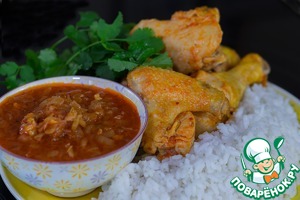 Пряности растереть в ступке или просто смешать, если они уже измельченные и добавить в луково-томатный соус. Соус выправить на соль/сахар/кислоту - в зависимости от кислоты и сладости помидоров может понадобится сахар или кислая составляющая (яблочный или винный уксус, лимонный сок - на ваш вкус). Соус должен быть очень ярким по вкусу. Переложить соус в кастрюлю курице и тушить курицу до готовности.