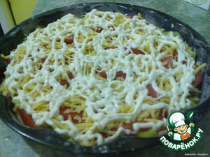 Уложить на противень тесто, помидоры, сосиски, лук, перец, помидоры. Посыпать сыром и полить майонезом.