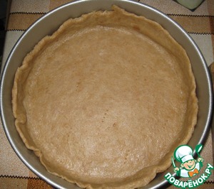 Раскатываем тесто в большой тонкий круг. Я поместила в форму диаметром 25см. Накалываем вилкой.