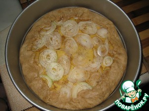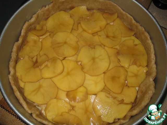 Яблоки очищаем, нарезаем тонкими ломтиками. Раскладываем в один слой по всей поверхности теста (край остается свободным). Сверху выкладываем картофель, а на него - тонкие кольца лука. Посыпаем кориандром.