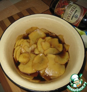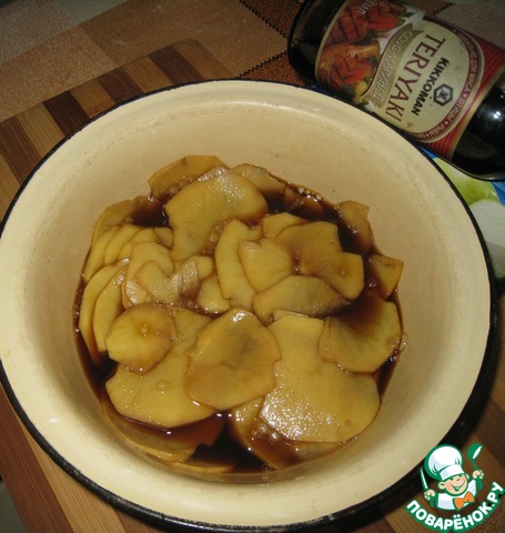 Картофель очищаем, нарезаем тонкими ломтиками, заливаем соусом-маринадом терияки Киккоман. Оставляем мариноваться на 2 часа.