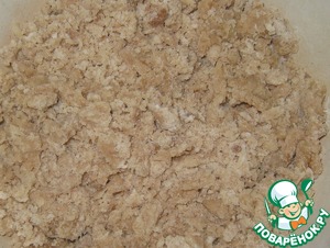 Смешиваем два вида муки, выливаем масляную смесь. Размешиваем до получения влажной крошки.
