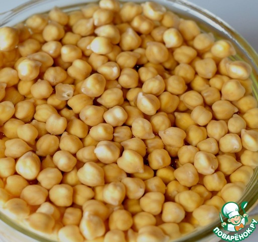 Нут замочим в большой посуде в холодной воде на ночь. Воды должно быть в 5 раз больше, чем нута. За ночь он сильно увеличится. Утром зальём нут свежей порцией холодной воды (1:5), доведём до кипения и оставим вариться на маленьком огне в течение часа. В конце варки добавим соль по вкусу. Далее дадим нуту полностью остыть. Отвар сохраним.