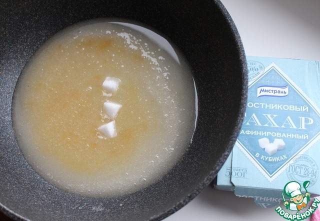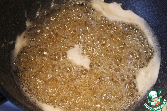Смешать сахар, воду и мед. Если Вы используете, как и я, сахар-рафинад Мистраль, то дайте минут 5 постоять, чтобы сахар впитал в себя воду. В некоторых вариантах этого рецепта вместо меда идет кукурузный сироп. Но, во-первых, его труднее найти, а во вторых, инвертные сахара (которые являются главными составляющими сиропа) в естественном виде встречаются в меде. Поэтому я отдаю предпочтение последнему. Однако выбор за Вами! Перелить смесь в достаточно большую кастрюлю или сотейник (это очень важно, потому что после добавления в карамель соды смесь увеличится в объеме в несколько раз), поставить на небольшой огонь и при постоянном помешивании добиться полного растворения сахара.