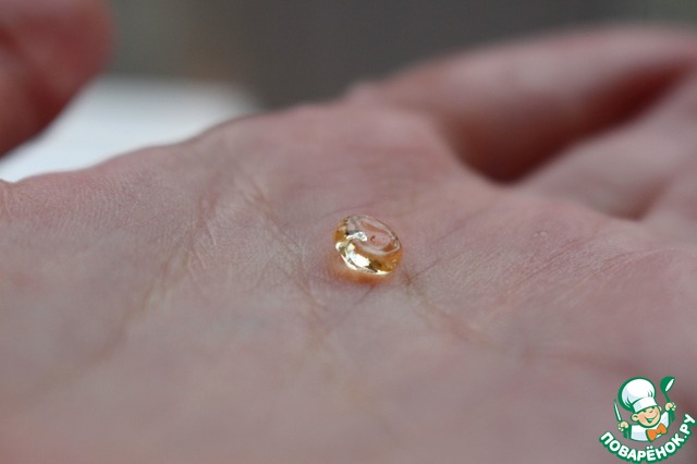 При отсутствии термометра готовность карамели проверяем следующим образом: капаем с ложки карамель в холодную воду; если получился твердый шарик, карамель готова. (Не путайте с мягким шариком: после остывания из капли можно пальцами скатать мягкий шарик. Из твердого - нет.) Карамель должна быть золотистого цвета, не доводите до коричневого, в противном случае конфеты будут горчить.
