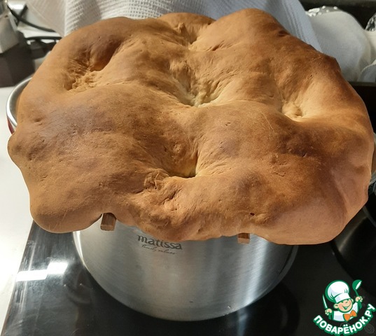 На них раскатанное тесто. Палочек много не нужно, тесто должно немного проваливаться в кастрюлю. В середине делаем надрез. Ставим в разогретую духовку - до готовности теста.