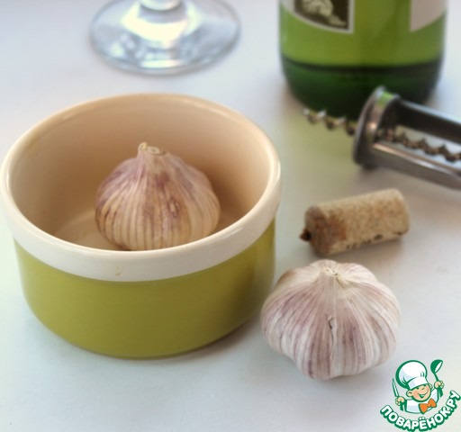 У головок чеснока немного подрезать нижнюю часть, положить в небольшую форму для запекания, налить стакан вина, добавить сахар и поставить в разогретую 200* духовку на 15-20 мин.