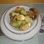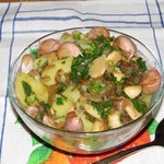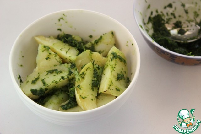 Перемешать картофель с зеленью. Можно сказать, что это уже законченное блюдо, вкусно, свежо, но мы идем дальше...