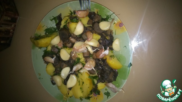 Добавляем к картофелю грибы, печеный чеснок, выравниваем на вкус, и салат готов.