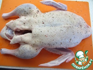 Утку помыть и обсушить. Так как обычно я покупаю утку накануне, с вечера натираю ее смесью соли перцев. Этот шаг можно пропустить.
