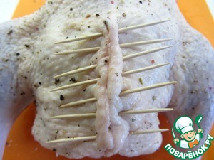 Утку заполнить фаршем и скрепить деревянными зубочистками отверстия. -
