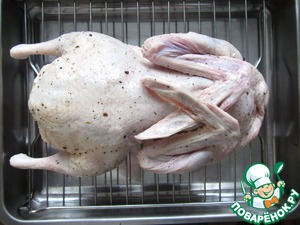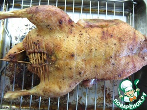 Подготовленную утку уложить на противень грудкой вниз. Мне нравится поддон с решеткой: лишний жир стекает вниз (как в аэрогриле) и утка в нем не " плавает."