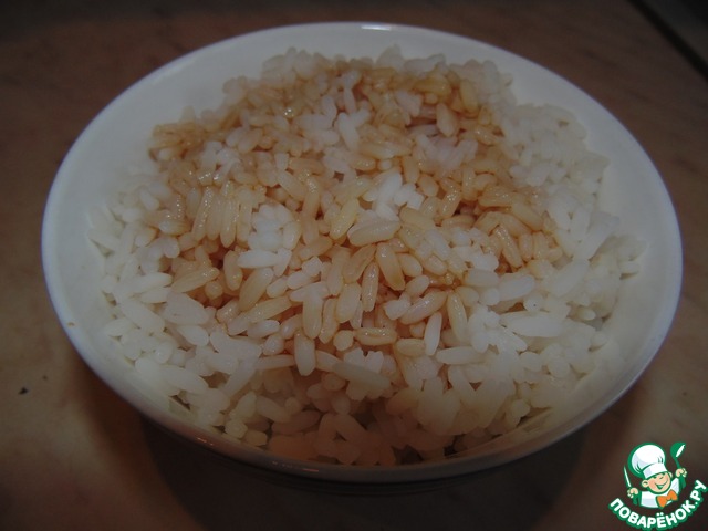 Рис (у меня пропаренный) промыть, отварить почти без соли. Промыть и полить соевым соусом Kikkoman.