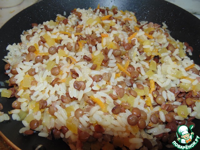 К тушенным овощам добавить чечевицу и рис.