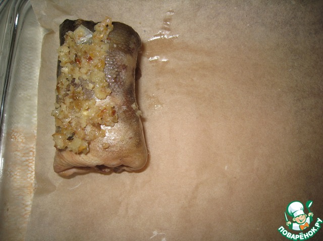 Сворачиваем рыбу в рулеты и выкладываем в форму на пергамент. Оставшуюся начинку распределяем сверху на рулетах.