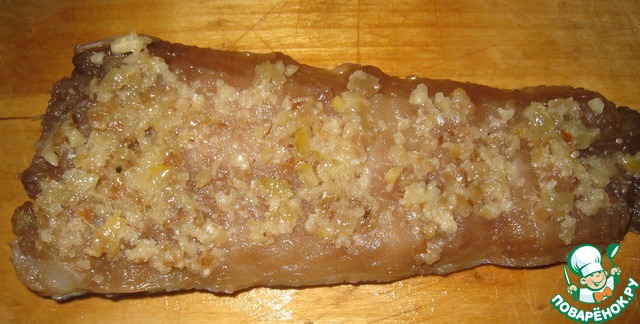 Креветочная рыба рыбаками часто зовется морским угрем, а после маринования в соевом соусе внешне становится похожа на угря. В качестве начинки я использовала смесь изюма, орехов и лимона. Получилось вкусно!
