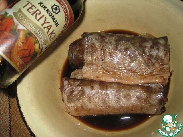 Рыбу (у меня креветочная) заливаем соусом-маринадом терияки Киккоман. Оставляем мариноваться на 2 часа.