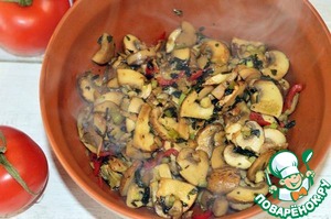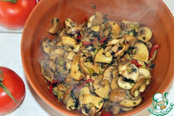 Отправляем в сковороду грибы. Продолжаем жарить порядка 5 минут до готовности (если используете белые грибы, их предварительно нужно отварить)!!!