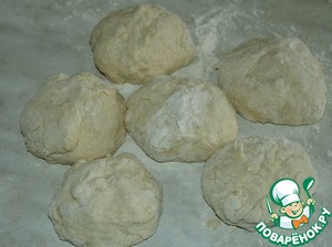 Просеем муку и добавим в нее разрыхлитель и щепотку соли. Понемногу добавляя воду, замесим мягкое тесто.