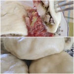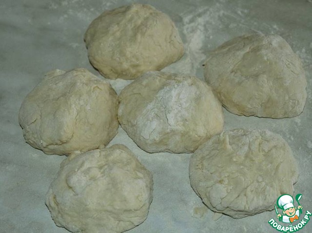 Руками раскатаем каждую часть в пласт толщиной 0,5 см и распределим начинку. Защипываем края и формируем кругленькие булочки (пирожки).