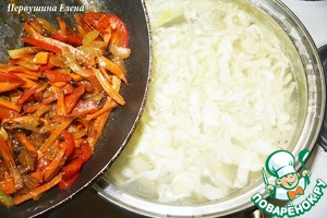 Поставить воду на плиту для закипания. Лук нарезать кубиками, морковь натереть на крупной терке или нарезать на полосочки, а перец нарезать соломкой.