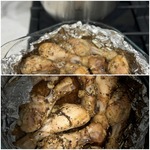 Готово! Несмотря на то, что запекали ножки без кожи и масла, они получаются довольно таки сочными и выделяют много сока, который при остывании густеет и прекрасно подходит в качестве соуса к гарниру. На гарнир у меня был рис, сваренный в пароварке с добавлением кари и сушеного чесночка.