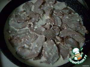 Для соуса: муку развести сметаной и водой и залить им мясо, запечь до корочки.