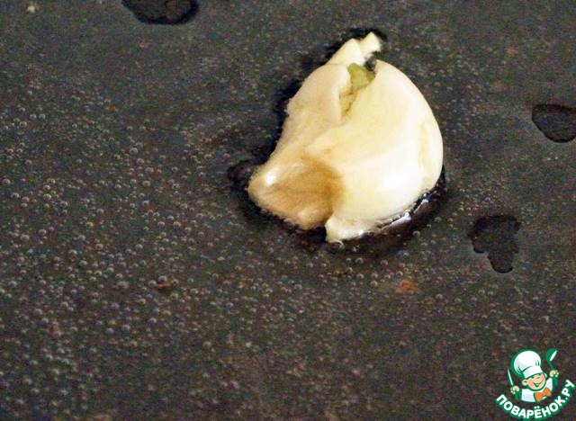 Зубчик чеснока очистим и раздавим широкой частью лезвия ножа. Отправим в разогретую сковороду с небольшим количеством масла, чтобы чеснок отдал маслу все свои ароматы. Поджарим его, периодически переворачивая, до золотистого цвета и выбросим.