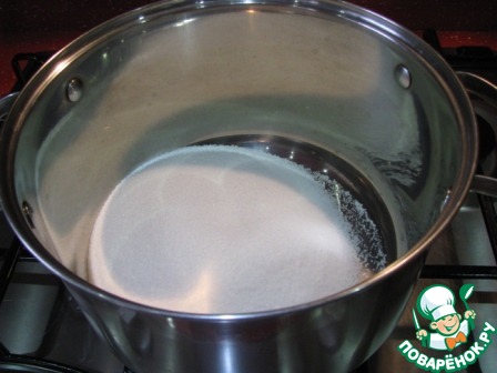 В сотейник всыпать сахар, добавить 130 мл воды, поставить на средний огонь и помешивая растопить сахар.