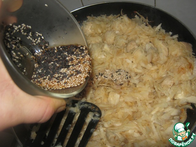 Заправить смесью семян и соуса ТМ "Kikkoman" и потушить ещё пару минут