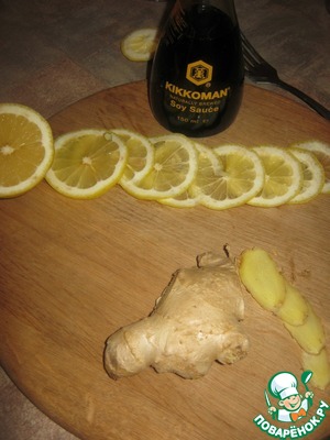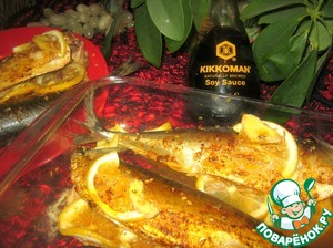 - Соевый соус (соевый соус ТМ "Kikkoman": 3 ст.л. на замачивание рыбы, 2 ст.л. для соуса) — 5 ст. л.