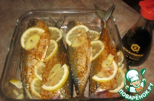 Скумбрию хорошо промазать соусом, начинить дольками лимона, сверху положить по ломтику имбиря