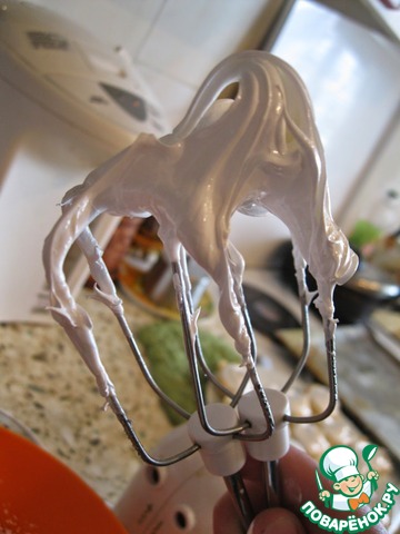 Пока варится сироп, нужно взбить белки в крепкую пену. Затем вливать тонкой струйкой при постоянном взбивании кипящий сироп. Взбивать около 10 минут на быстрой скорости Готовый крем гладкий, блестящий, хорошо держит форму. -