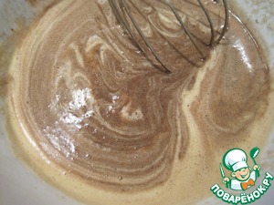 Отдельно растопим 85 грамм шоколада и 85 грамм сливочного масла. В другой посуде взобьём яйца с добавлением ванилина, кофе и сахара. Взбиваем пока масса не станет гуще. Затем добавим растопленное масло и шоколад. Все жидкие составляющие перемешаем до однородности.