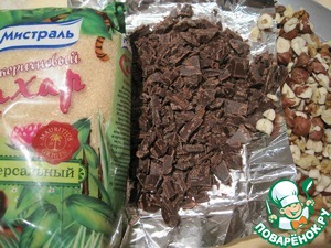 Шоколад (оставшиеся 100 грамм) и орехи не очень мелко порубим ножом.