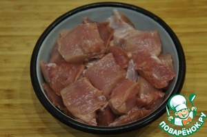 В кастрюле с толстым дном разогреть немного масла. Выложить нарезанную кусочками свинину и зарумянить со всех сторон.