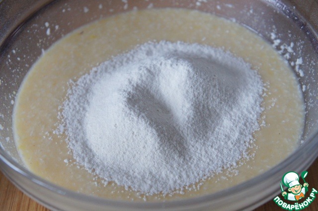 В лимонный сок всыпать соду и запенившуюся массу сразу же вмешать в тесто.