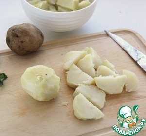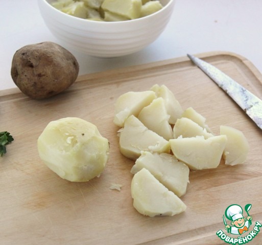 • Отварить картофель в мундире в подсоленной воде. Остудить, почистить.