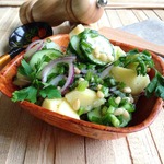 • Полить блюдо заправкой, посолить, поперчить свежемолотым перцем, перемешать. Картофель пропитывается соусом, становится безумно вкусным, от зелени свежий аромат, огурчики похрустывают, ум отъешь!