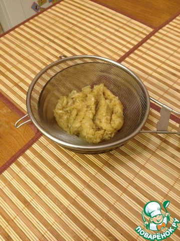 Готовый картофель перекладываю в мелкое сито, чтобы стекло лишнее масло. Помешиваю, слегка надавливаю на массу. Не пугайся, если масса превратится в комок.