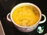Солю, перчу по вкусу, добавляю любимые травы. У меня специи "чеснок и травы", в состав которых входит: чеснок, пажитник, тимьян, розмарин, мята, лук. Помешиваю. (Если готовишь с картошкой "фри", то на этом этапе добавляй ее в суп)
