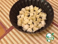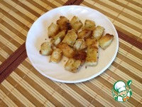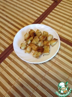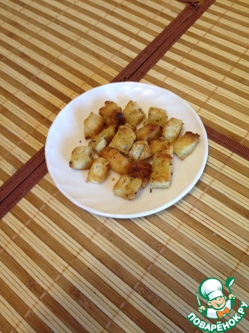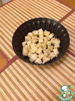 С батона срезаю корочку, мякоть режу кубиками, выкладываю в форму для запекания, сбрызгиваю оливковым маслом, посыпаю теми же травами. Минут 7-10 в духовке при температуре 200 градусов. В процессе готовки сухарей, пару раз помешиваю для равномерной корочки.
