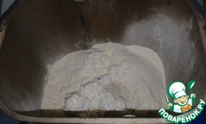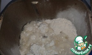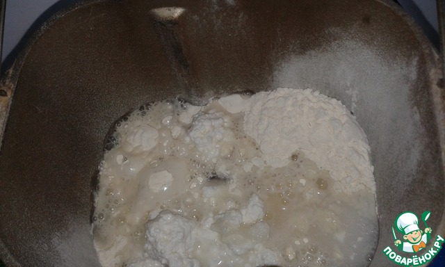 В ведерко хлебопечки положить дрожжи, просеянную муку, творог