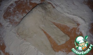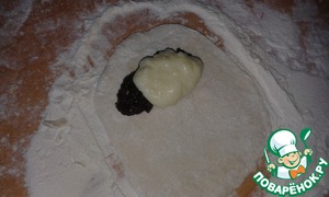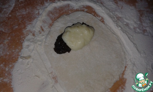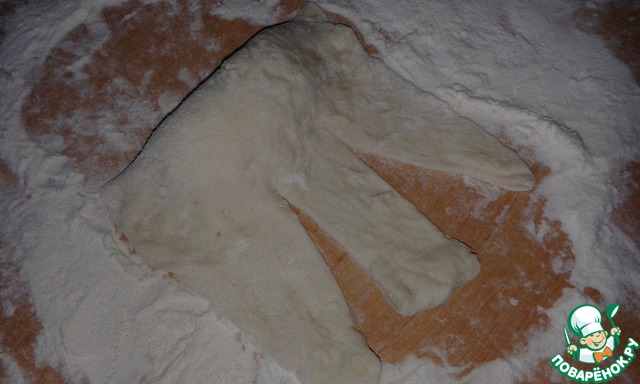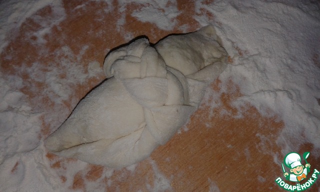 Далее тесто свернуть примерно до половины и прижать, чтобы начинка не вытекла. Оставшийся край разрезать на три части