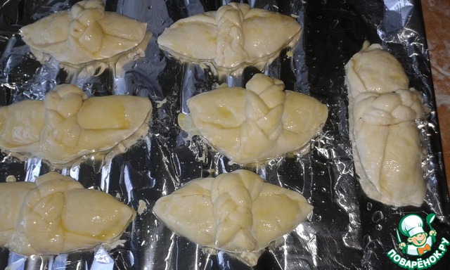 Таким образом сформировать все булочки, выложить на смазанный маслом противень дать подойти около 20 минут, смазать яйцом