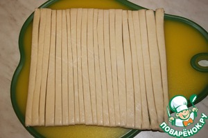 Тесто размораживаем и раскатываем толщиной 0,5 см между двумя слоями пищевой пленки (иначе прилипает). Если тесто продавалось в тонких пластинах, этот пункт можно пропустить. Не снимая пленки, нарезаем тесто тонкими полосками.